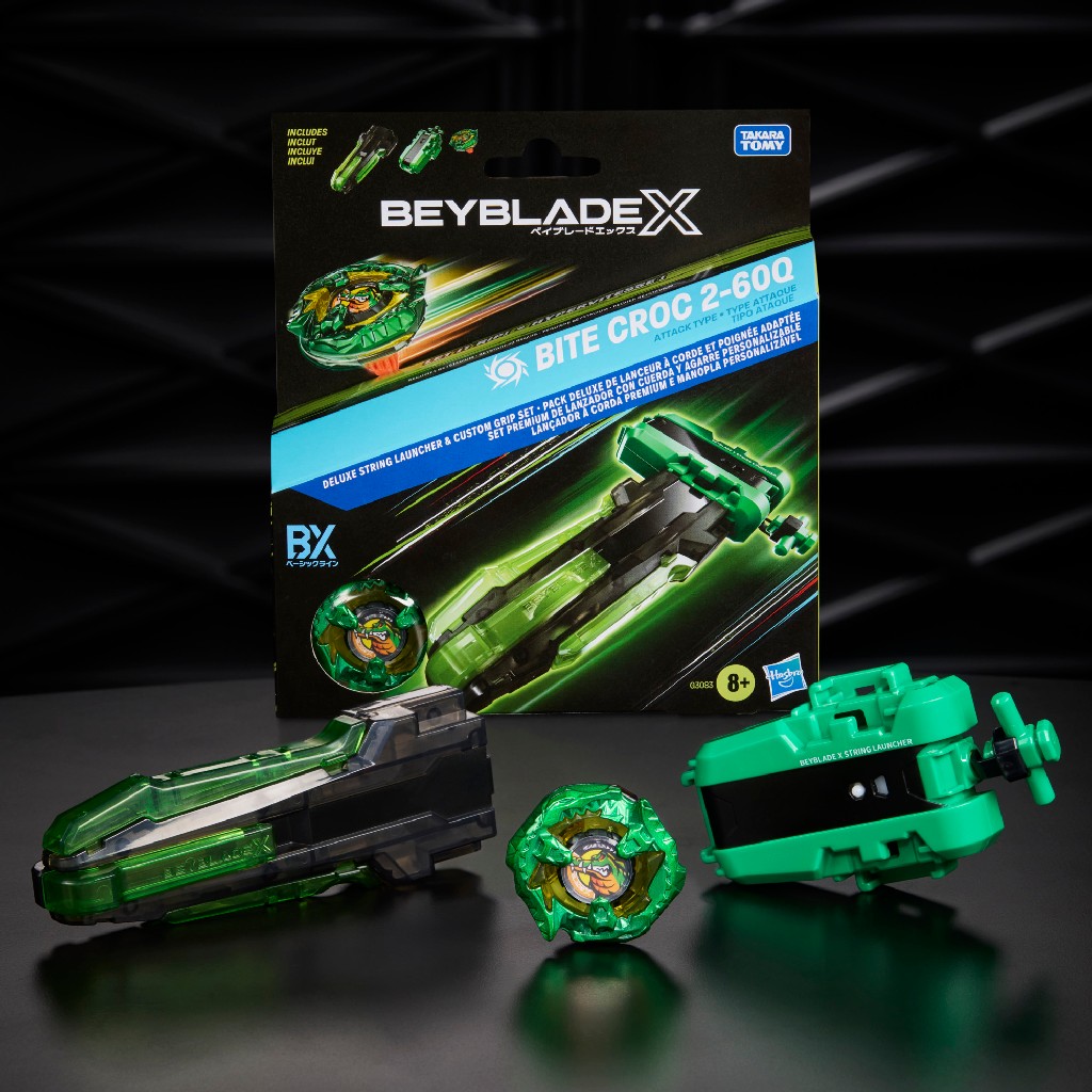 Fans can also gear up with the new BEYBLADE X Deluxe Launcher and Custom Grip Set, available exclusively at Walmart for pre-order the same day. This setincludes a right-spin Launcher, custom grip that attaches in multiple ways for greater launch control, and the Bite Croc 2-60Q Right-Spin Attack Type Top, designed to work with the X-Celerator Gear System. Both sets will be available for purchase on July 15, 2026, giving fans even more ways to power up their battles.